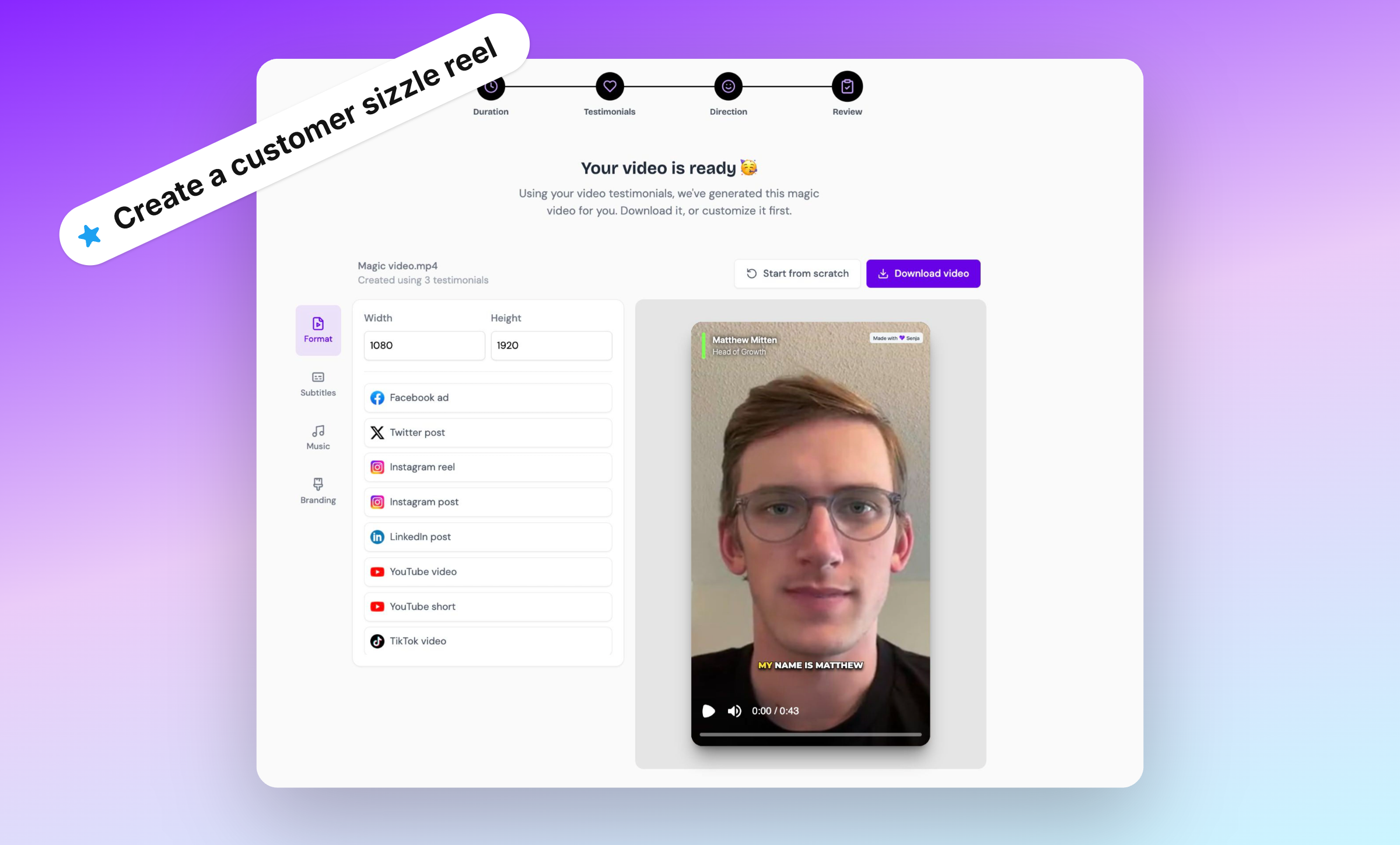 This feature allows you to instantly create engaging remixes of your customer video testimonials to share on Instagram, YouTube, LinkedIn, X, Facebook and your website.