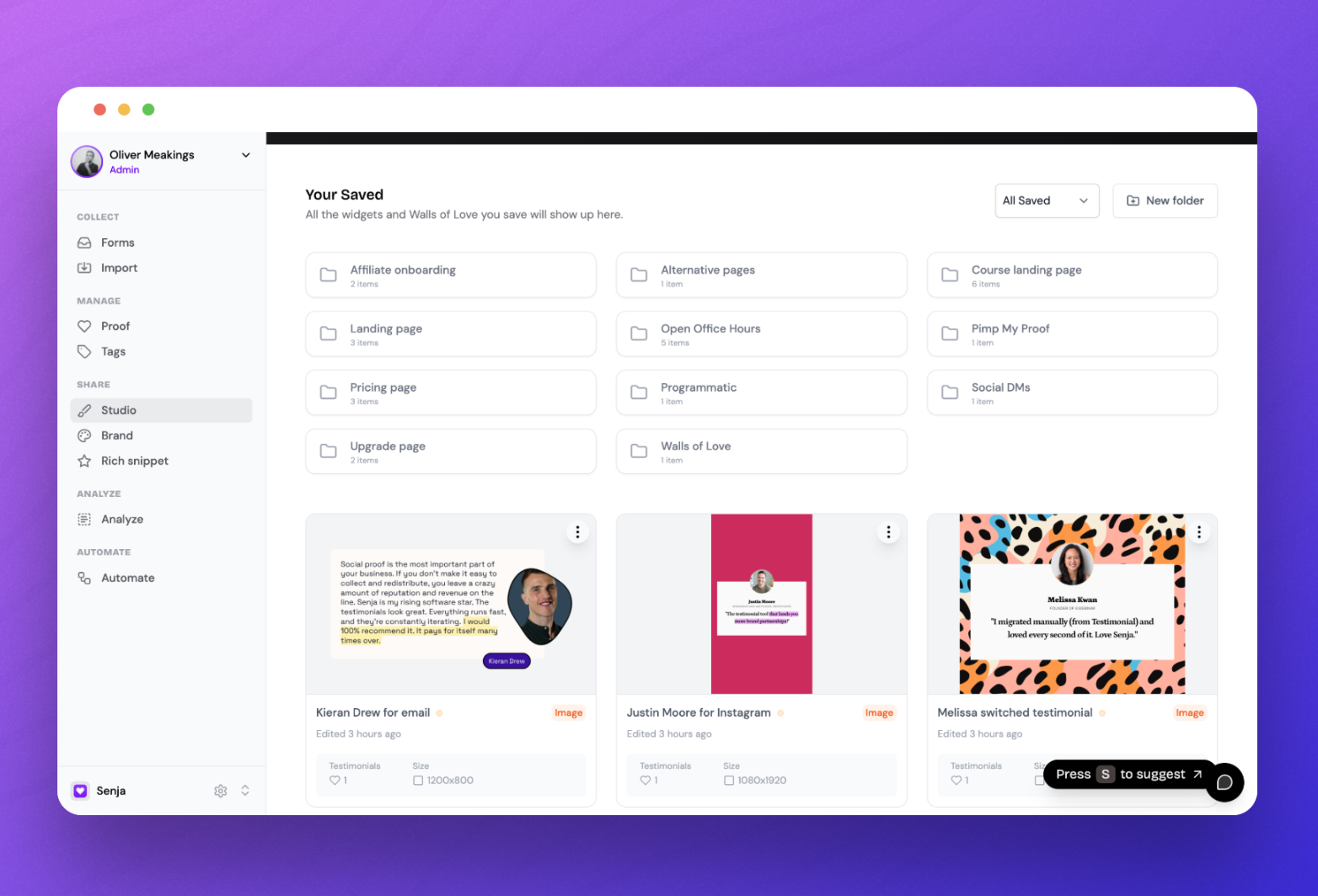 You can now save your testimonial images directly in the Studio. This makes it easy to build and maintain a library of social proof content, and make it available to your whole team.